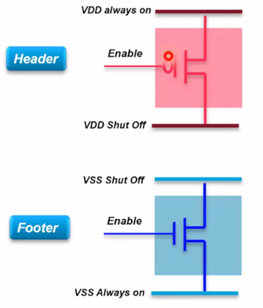 - Ground shut off:footer switch,简单建模成NMOS连接到地网络,因为电子的迁移率高于空穴
